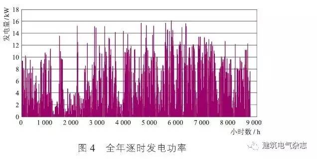 逐時光伏板發電功率為Q s= S η1η2P rad。其中,P rad為光伏板法向的逐時太陽輻射強度(單位:W / m2)。計算得到全年逐時發電功率如圖4所示。
