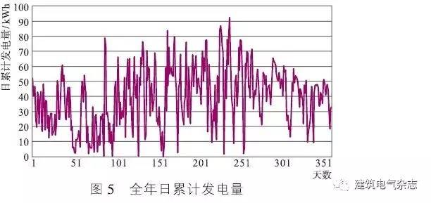 每日累計的總發電量如圖5所示(DeST氣象參數為歷年典型氣象參數,考慮了陰天等氣象的隨機變化,故存在日累計發電量突降的情況)。日累計發電量最大為92. 5 kWh。